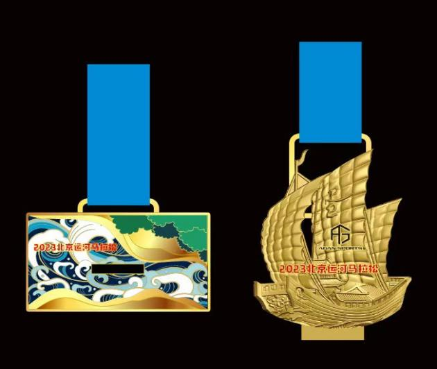 (二)运河马拉松奖牌:由中国阿甘许秀涛设计,马拉松奖牌根据比赛日期分为两种北京运河马拉松背靠背奖牌,由两块奖牌组成,周六完赛奖牌采用为运河的设计形式,立体翻滚的水波纹组成了源远流长的运河。周日奖牌采用古代运船的为设计元素,第一个奖牌名为大运河,代表生生不息。第二个奖牌名为运船,代表一帆风顺。两个奖牌插合在一起又名“扬帆起航”,“满载而归”。一天完赛奖牌仅仅是奖牌,两天连续完赛就是插在一起形成一个可摆放的立体奖杯。(奖牌图片仅参考,以实物为准)