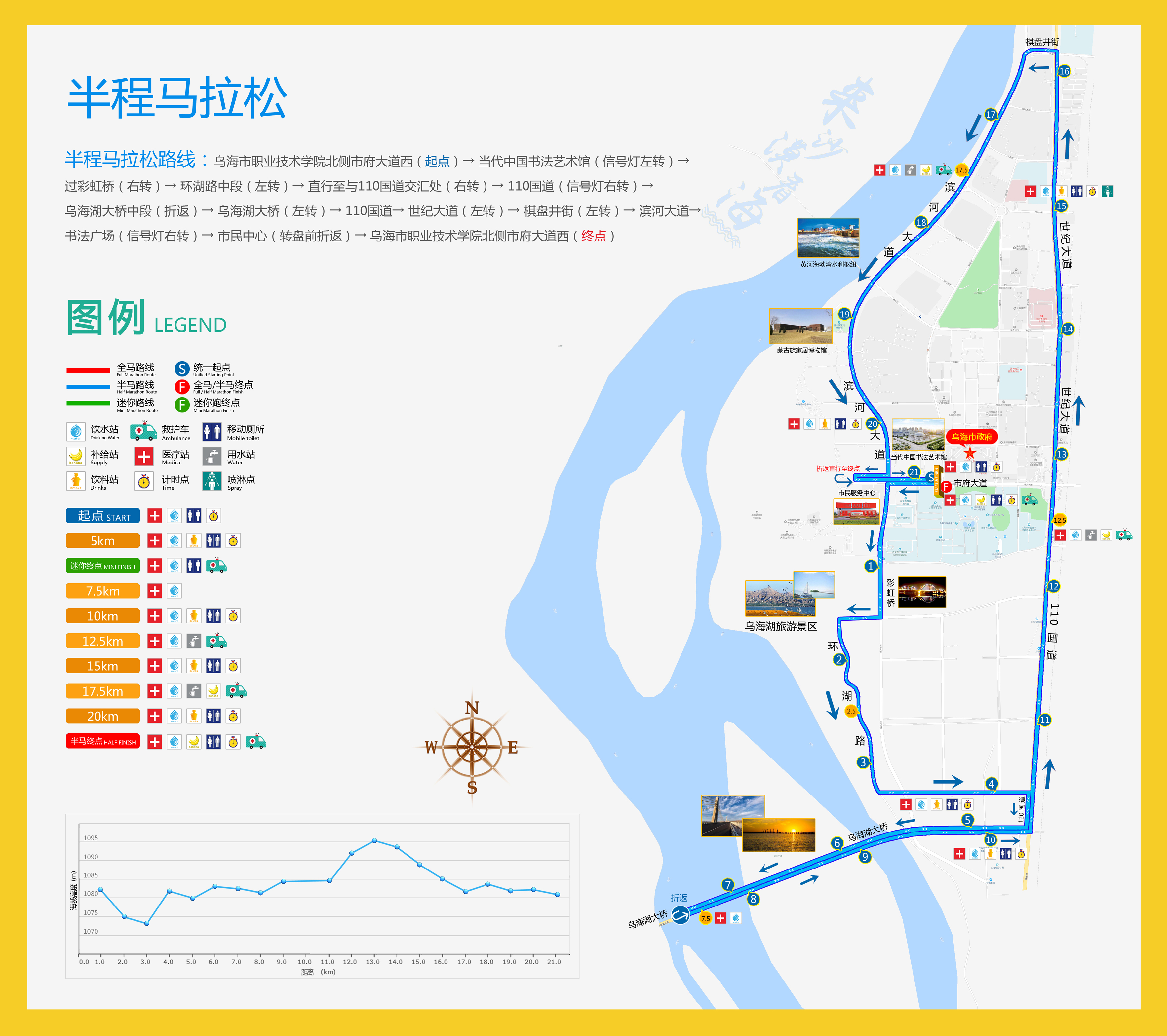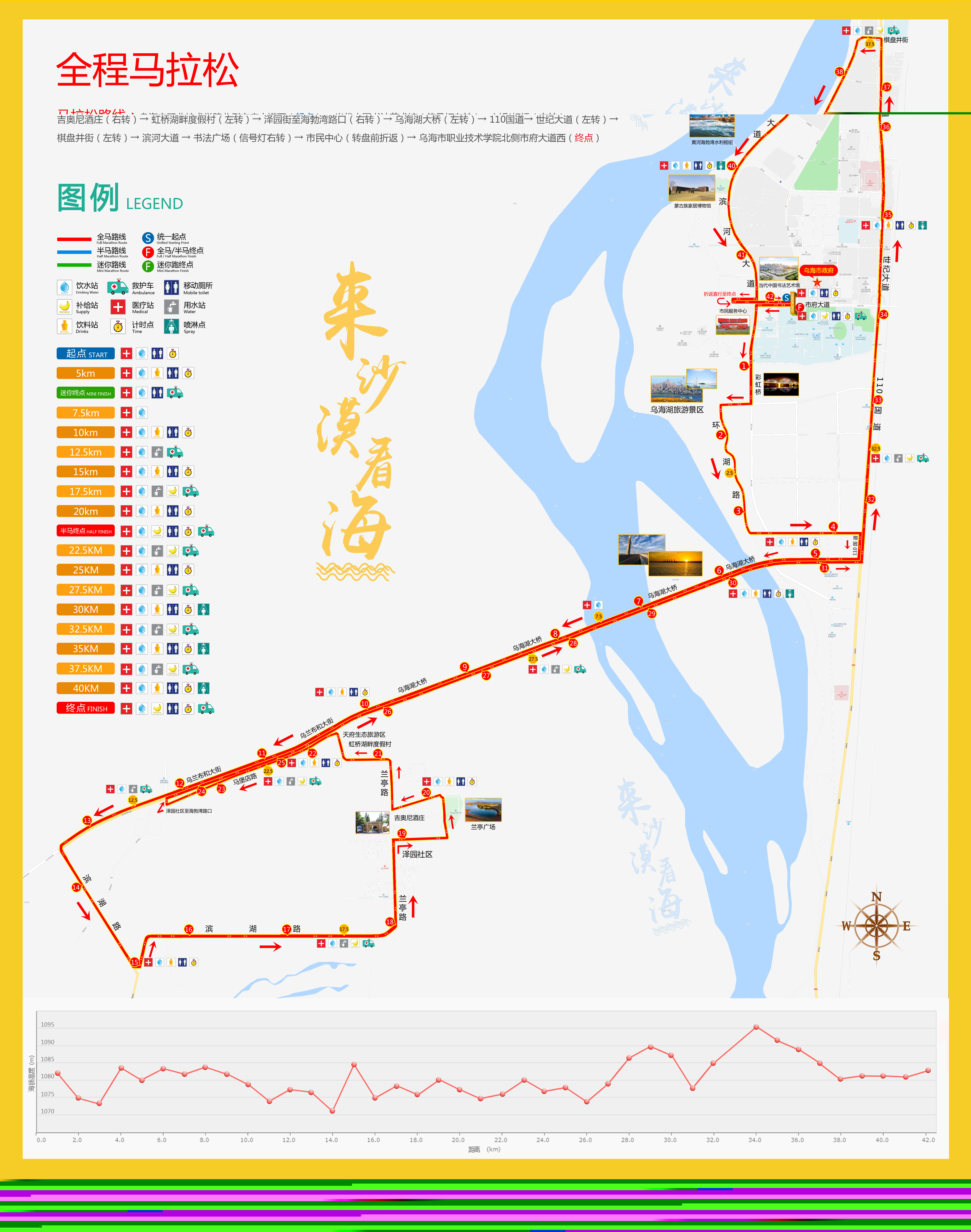 (一)马拉松路线:乌海市职业技术学院北侧市府大道西(起点)→ 当代中国书法艺术馆(信号灯左转)→ 过彩虹桥(右转)→ 环湖路中段(左转)→ 直行至与110国道交汇处(右转)→ 110国道(信号灯右转)→ 乌海湖大桥→ 乌兰布和大街(第二个信号灯左转)→沿滨湖路直行至丁字路口(左转)→ 滨湖路与兰亭路交叉口(左转)→ 泽园社区(右转)→ 乌海湖兰亭广场景区(左转)→ 吉奥尼酒庄(右转)→ 虹桥湖畔度假村(左转)→ 泽园街至海勃湾路口(右转)→ 乌海湖大桥(左转)→ 110国道→ 世纪大道(左转)→ 棋盘井街(左转)→ 滨河大道→ 书法广场(信号灯右转)→ 市民中心(转盘前折返)→乌海市职业技术学院北侧市府大道西(终点)
