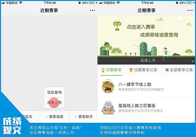 跑步时通过任意一款跑步APP计数,记录自己的跑步数据及时间,作为参赛完成凭证。跑步完成后,并将跑步成绩和报名凭证上传至微信公众号,即代表完赛。