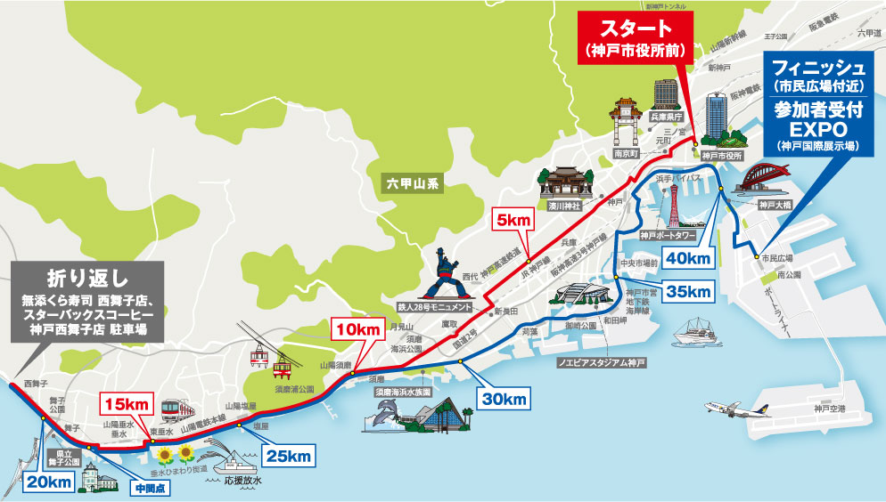 在40公里时,选手们将跑过全长319米的神户大桥,欣赏到日本内海的怡人风景。