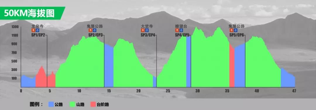 累计爬升:3401m(8.5小时未到达“阳台山北三岔路口”的选手必须改走27KM回程路线,实际完赛距离38KM,享受与50KM同等完赛待遇,但是不享有ITRA积分)