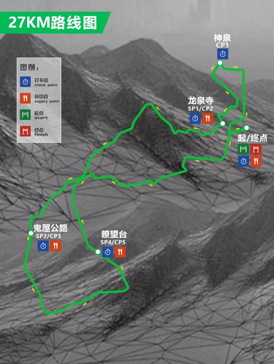 备注:50KM参赛选手,8.5小时未到达“阳台山北三岔路口”,必须改走27km回程路线,实际完赛距离38km,享受与50KM同等完赛待遇,但是不享有ITRA积分。