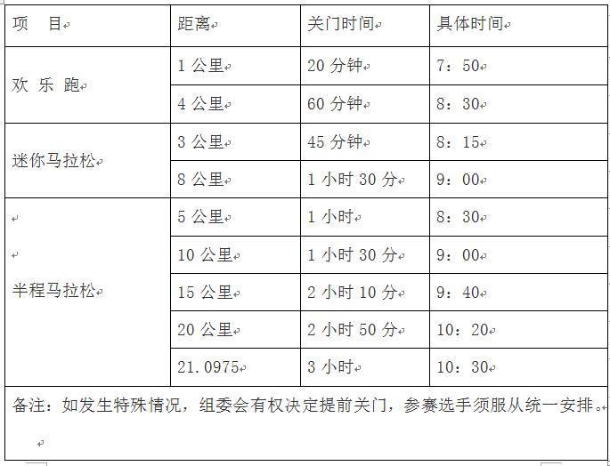 4) 半程马拉松比赛采用感应计时芯片,参赛者必须佩带计时芯片,在起终点及途中设有感应计时芯片感应带,参赛者行进中必须逐一通过地面的计时芯片感应带,如选手缺少任何一个感应点的成绩,将取消该运动员的比赛成绩。组委会提供一次性计时芯片,将在赛前与号码布一起领取。(详情请参阅《参赛指南》)5)关门点和时间限制:为了保证参赛运动员比赛安全、顺利,比赛期间比赛路线各段设关门时间,限时进行交通封闭。起跑至关门时间到后,各路段恢复正常交通。在规定的关门时间内,未跑完对应的距离者须立即停止比赛,退出赛道,以免发生危险。退出的参赛者可乘坐组委会提供的收容车到相应项目的终点处。