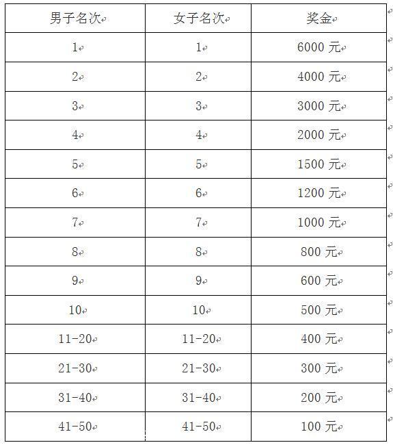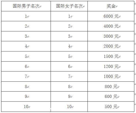 1)国际奖 男、女1-3名按枪响成绩排名,其他名次按净计时排名,并分别获得现金奖励见下表。若枪声成绩相同,则按净计时成绩录取(单位:人民币)。