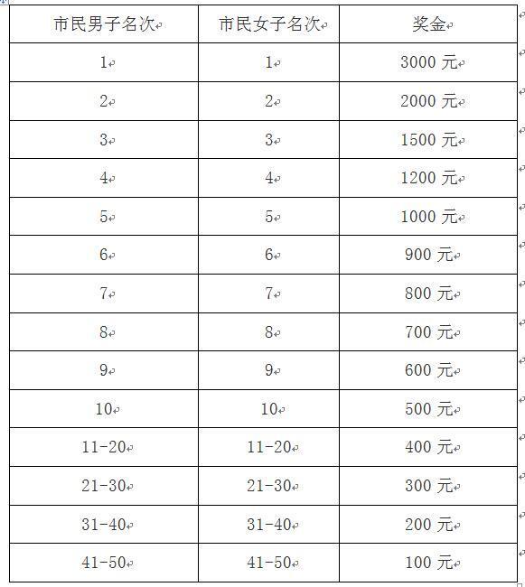 3)市民奖 泰州市民半程马拉松的参赛选手,户籍所在地须在泰州市范围内(注册的中长跑运动员不准参加此项目);男、女1-3名按枪响成绩排名,其他名次按净计时排名,并分别获得现金奖励见下表。若枪声成绩相同,则按净计时成绩录取(单位:人民币)