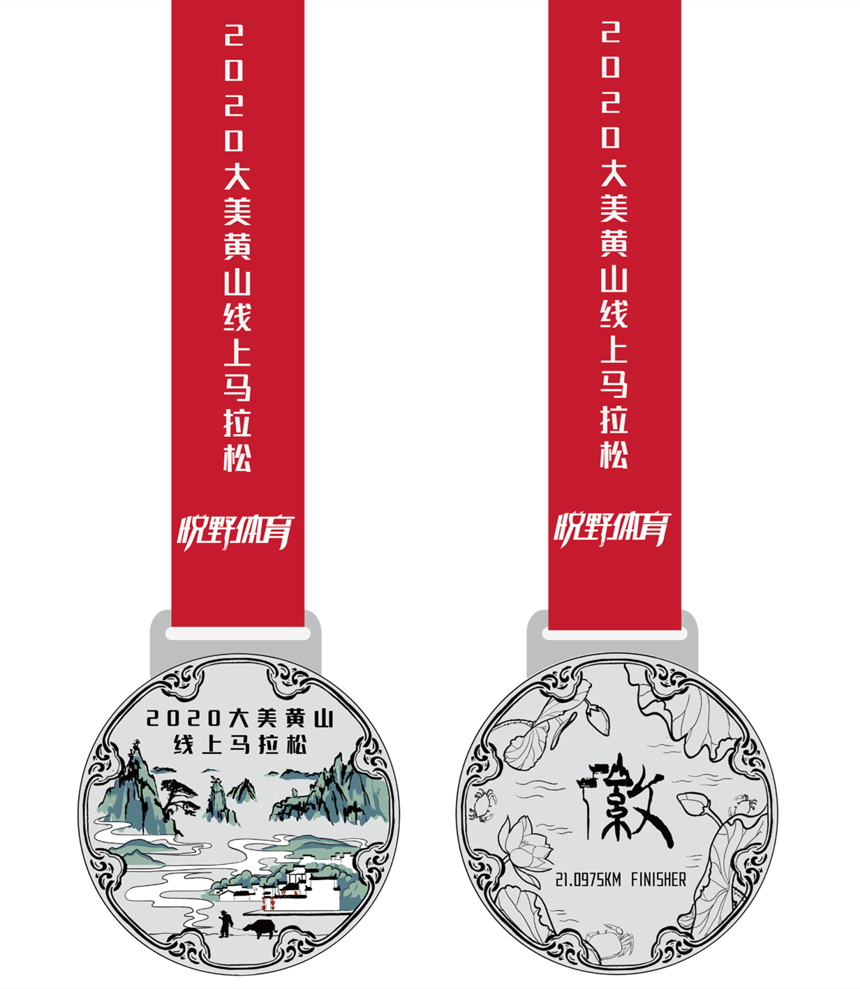 完赛纪念奖牌效果图(奖牌整体仿照徽州三雕之一的砖雕做外形,正面取大美黄山和绝美徽州画里乡村的意象,就像一幅水墨画,奖牌背面以“徽”为主视觉,解构“徽”字,其实它是由“山”、“水”、“人”、“文”四字构成,这四字共同组成了风采多姿的徽州。外圈荷花和螃蟹的组成,生动有趣,也意寓“和谐”。)