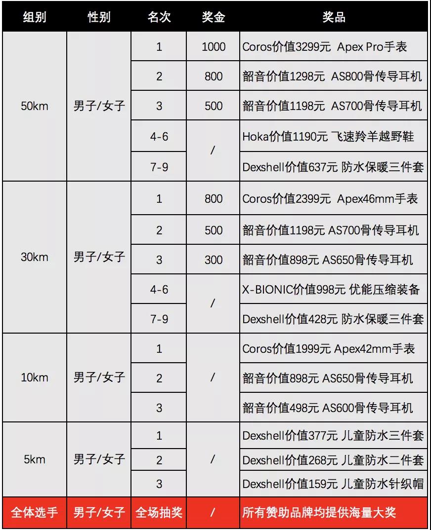 赞助品牌:HOKA ONE ONE 、COROS高驰、AfterShokz韶音耳机、UltimateDirection、BlackDiamond、Sea To Summit、X-BIONIC、Julbo、DexShell戴适、冰立舒、Decathlon迪卡侬