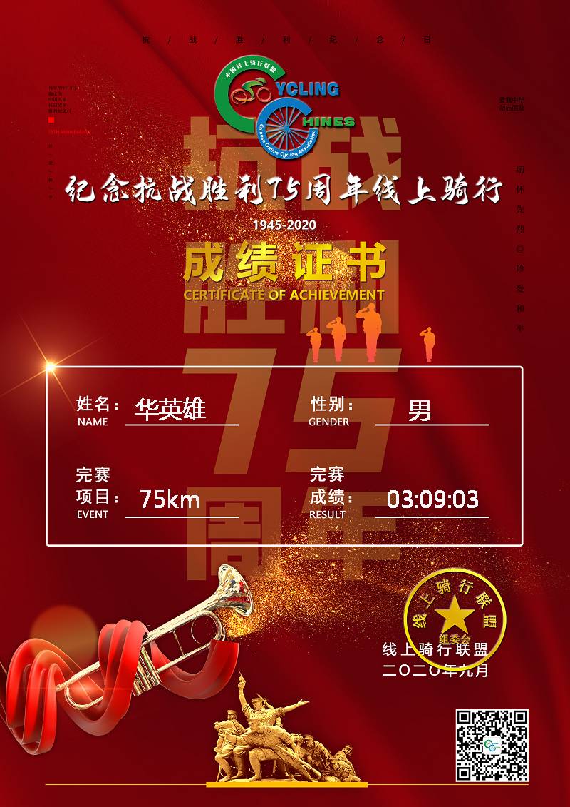 2020年9月3日是中国人民抗日战争胜利75周年,为纪念中国人民抗日战争暨世界反法西斯战争胜利75周年,线上骑行联盟特别推出纪念主题线 上骑行赛。