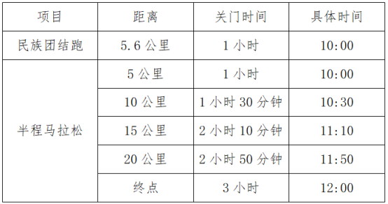 (九)关门时间:为了保证参赛选手比赛安全、顺利,比赛期间比赛路线各段实行限时交通封闭,关门时间到后,相应路段将逐段恢复开放社会交通。参赛选手在规定的关门时间内,未跑完对应的距离者须立即停止比赛,退出赛道,以免发生危险。退出比赛的选手可乘坐组委会提供的援助车到终点处。各项目关门时间见下表:半程马拉松及民族团结跑项目关门距离和时间(9:00 鸣枪时间为准)