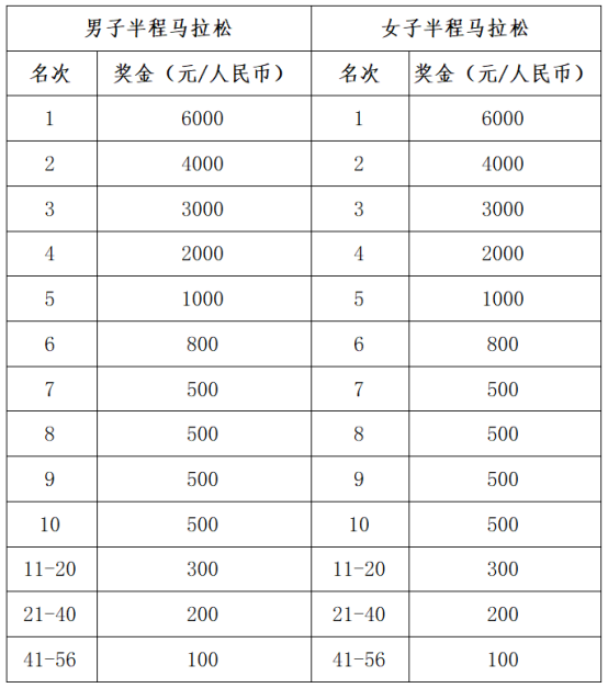 ③半程马拉松名次奖和少数民族奖前三名选手以枪声成绩决定奖励名次, 其他选手奖励名次均以净计时成绩决定。