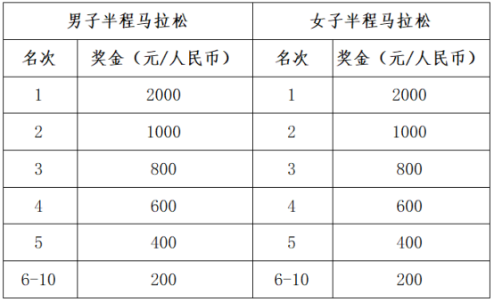 ①半程马拉松男、女前三名选手分别颁发奖杯一座、奖牌一枚。