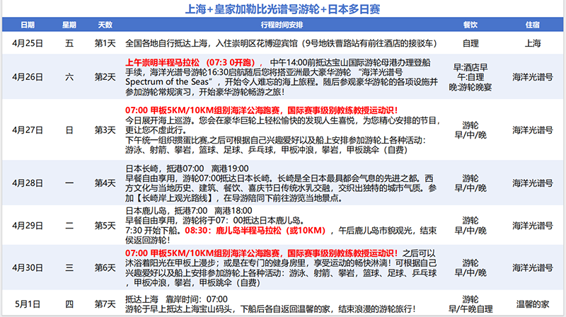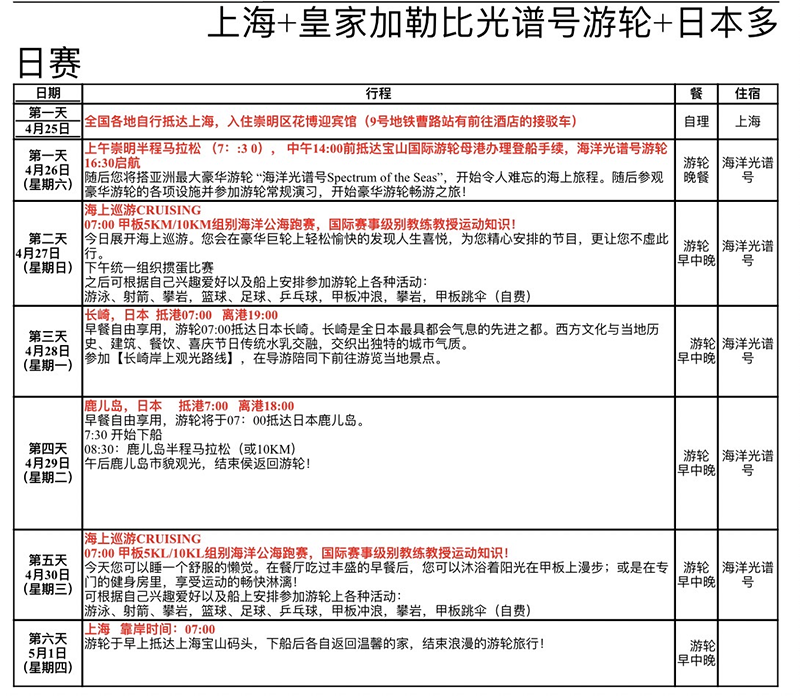 全球首创!邮轮马拉松,说走就走,奔跑旅行,打卡最美目的地,背对背挑战!皇家加勒比光谱号邮轮从上海港出发驶往太平洋深处,驶向日本鹿儿岛市参观旅游,跑一场传奇马拉松,跑一个世界上没有组织过的马拉松,本参加多日赛要乘坐组委会包船的邮轮以及遵从组委会行程安排,本站赛事是背靠背多日赛的第二场——太平洋邮轮马拉松,这场赛事在太平洋行进中世界最大邮轮-皇家加勒比光谱号邮轮的跑道上举行一场马拉松,看到壮阔太平洋,豪迈在心中汹涌!