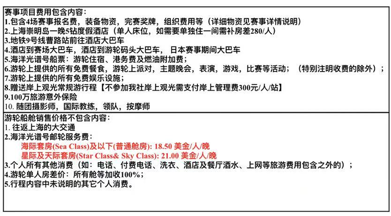 4,赛事报名费用,不含北京上海大交通费用,不含上海住宿,不含邮轮船票费用,报名联合多日赛船票和酒店等一站式配套服务再单独联系预定客服:陈晓博13701280040