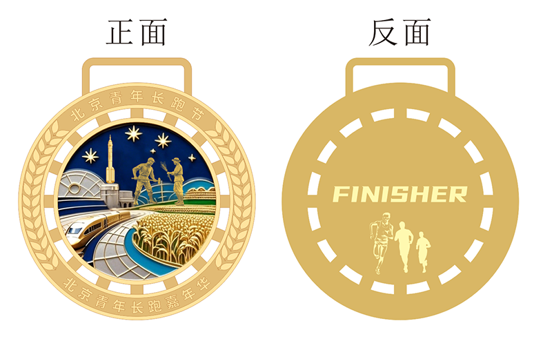 (二)所有组别的完赛奖牌,内容表现的是一对青年劳作的情形,代表为祖国奋斗的青年,实现中国梦的青年们。(下图为奖牌效果图,最终可能有变动,最终奖牌以实际为准,不同组别奖牌颜色不同,21公里为金色,10公里为银色,5公里为铜色):