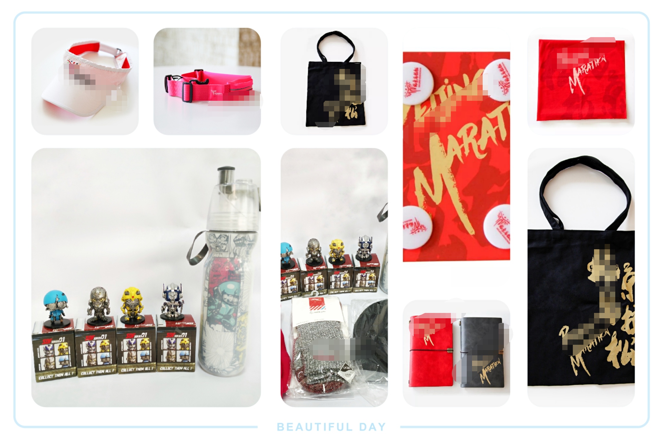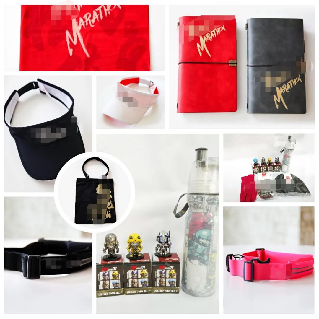 十几种商品(空顶帽、帆布包、腰包、手写笔记本、手办(共4款)、水壶、手套、袜子、头巾、马克杯......),产品款式包括且不限于以下图片展示,随机发送,不接受指定!商品涉及某国内马拉松衍生品,某IP商品,某品牌商品等等。绝对物超所值,例:某知名IP手办,某宝单卖目前售价39元/个。